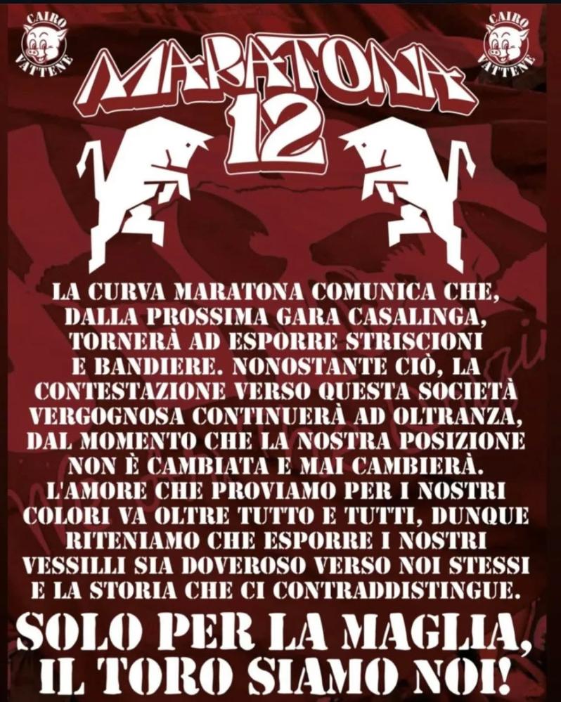 Dopo il comunicato dei Torino Hooligans, gruppo organizzato della Curva Primavera, arriva anche quello della Maratona 12 per ribadire che la contestazione nei confronti della società Torino Fc continuerà ad oltranza, quindi non entrando allo stadio nelle partite casalinghe, ma che esporrà in Curva i propri striscioni.